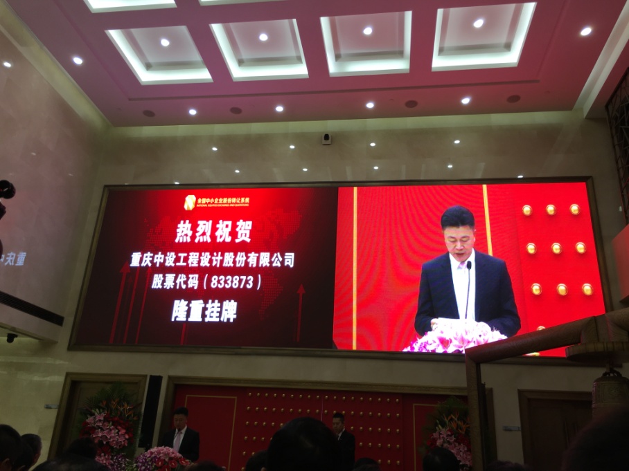 2015年11月6日下午5时,重庆中设工程设计股份有限公司(股票名称:中设股份,股票代码:833873)登陆全国中小企业股份转让系统(即“新三板”)敲钟挂牌仪式在北京成功举行。重庆市城乡建设委员会主任程志毅先生、全国人大环境与资源保护委员会委员和民建中央社会服务部部长包瑞玲女士、中国勘察设计协会常务副秘书长王子牛先生、重庆市江北区政府区委常委及常务副区长高洪波先生、江北区政协副主席周永中先生、重庆科技创业风险投资引导基金公司总经理伍雪女士、中国中小企业产业园建设专委会主任和重庆曙光都市工业园建设集团董事长汪官蜀先生、战略投资人——德同资本管理合伙人张乐先生、泰豪渝晟总经理李然先生、券商代表等来宾应邀出席,与中设股份的主要股东和员工代表等近50人共同见证了这一盛举。