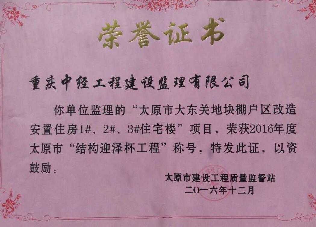 二0一六年十二月,由中设股份全资子公司-重庆中经工程建设监理有限公司监理的“太原市大东关地块棚户区改造安置住房1#、2#、3#住宅楼”项目顺利通过太原市相关部门的评审,正式获得太原市2016年度的“结构迎泽杯工程”称号。